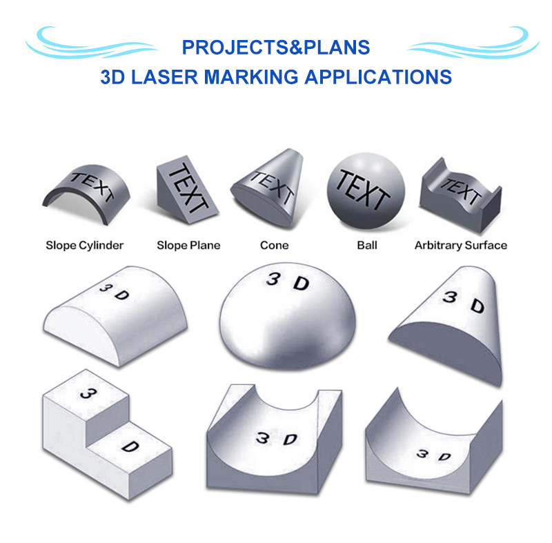 The machine will not deviate the focal point when working, it can real-time trace the deep-curved focuses. This makes the machines' efficiency and performance much better than the traditional 2D fiber laser marking machine. It totally breaks the traditional 2D marking model. The machine open up a new mode of 3D marking on oblique planes, segment gaps, cylinders, circular cones, spherical surfaces and extruded surfaces.